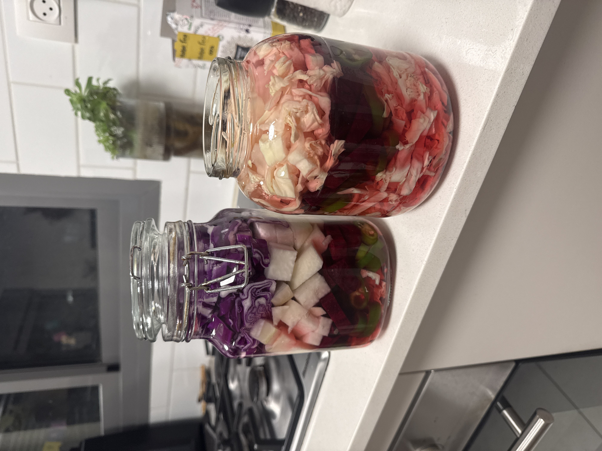 Two glass jars filled with a colorful mix of pickled vegetables sit on a white countertop. The top jar contains what appears to be cabbage and beets, imparting a pinkish hue to the contents. The bottom jar contains purple cabbage, white cubes (possibly radish or daikon), beets, and green chilies. A stove is visible in the background beneath the jars. The location is a kitchen setting in Ramat Gan, Israel. Other items are present in the background. The items are likely to be pickling.