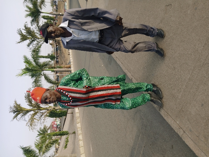 Two adult males are depicted walking outdoors on a paved surface in Mumbwa, Zambia. The individual on the left, an older male, wears a red conical hat, a multi-colored beaded necklace, and a green patterned long-sleeved tunic with matching trousers. A striped fabric in red, white, black, and grey is draped over his chest. He wears black dress shoes and looks forward and slightly left. The individual on the right, also an older male, wears a black baseball cap with a red emblem, a light grey suit jacket over a white collared shirt, dark grey trousers, and black slip-on shoes. He looks forward and slightly right. Both men are in motion, facing generally forward. The background features several palm trees of varying heights, with indistinct urban structures visible further in the distance under a clear sky. A concrete curb runs parallel to their walking path.
