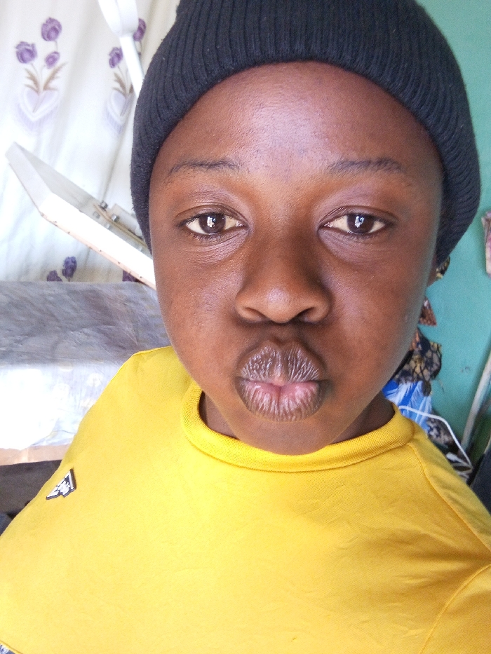 A close-up, eye-level photograph shows a person with dark skin, wearing a black knit beanie and a bright yellow short-sleeved t-shirt with a dark triangular logo on the left chest, located indoors in Maigizo, Nigeria. The individual is centered in the frame, looking directly at the camera with eyes open, while forming a distinct pout with their lips. The background on the left features a light-colored curtain adorned with a purple floral pattern, partially obscuring a white, elongated object. To the right, a light blue-green wall is visible. A greyish, textured surface appears in the lower left background.