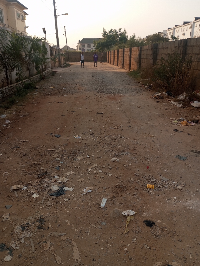 The scene depicts an unpaved, dirt road in Gwarinpa, Nigeria, under clear, late afternoon or early evening light
