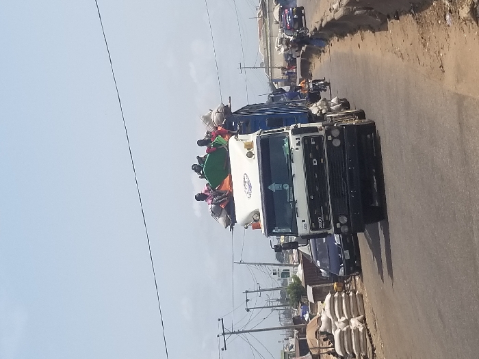 A daytime street scene in Lokoja, Nigeria, captures a white DAF 2800 heavy-duty truck with a blue trailer moving along a paved road