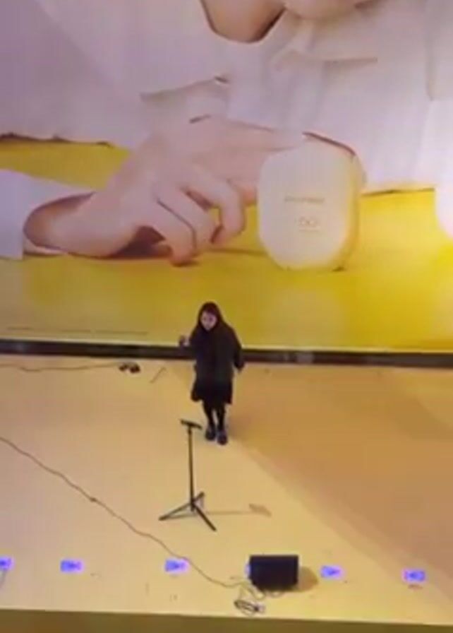 A woman in a dark coat and skirt sings into a microphone on a yellow stage. Behind her is a large advertisement featuring a person and a bottle of sunscreen. The woman stands near the center of the stage, facing forward. Cables and stage equipment are scattered on the floor. In the bottom of the frame, parts of several people are visible, suggesting an audience.