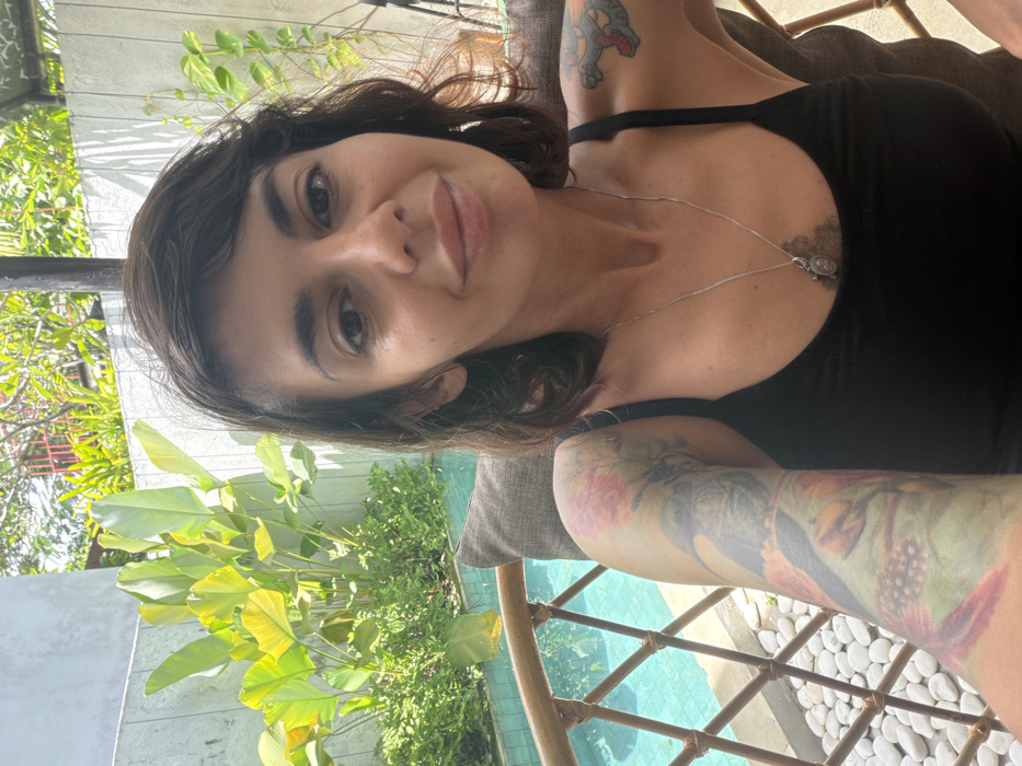 A woman with dark hair and fair skin smiles at the camera. She wears a black tank top and a silver necklace. Her arms are covered in tattoos. She is sitting in a wicker chair outdoors. Behind her, there is a pool with white pebbles, and various plants. A white wall is also visible in the background. The photo appears to be taken on a sunny day.