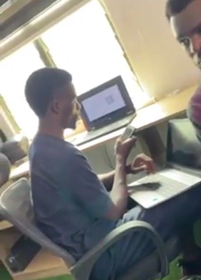 n office space with two men working on laptops. The room has a window with blinds, desks, ergonomic chairs, a whiteboard, and artificial grass on the floor. One man is wearing a grey shirt and dark pants, sitting at a desk using a laptop and holding a phone. Another man, wearing a plaid shirt and a Bluetooth earpiece, is looking over his shoulder at the first man's screen. The camera then pans around the room to show other empty desks and chairs before focusing on another man wearing a white shirt and a black cap, also working on a computer at a desk.