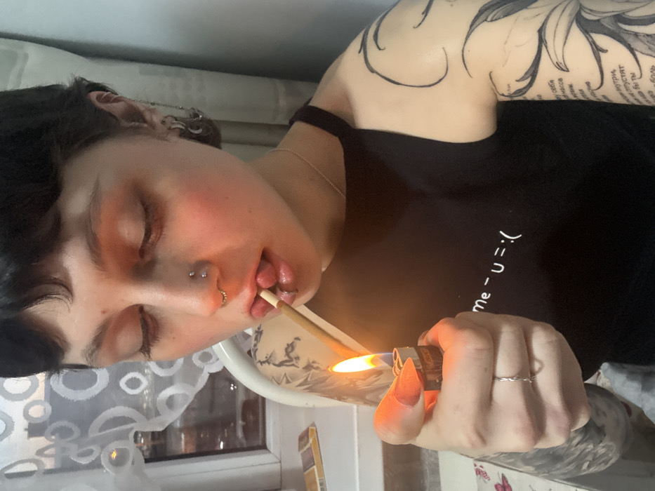 The scene is an indoor setting at night within the city of Saint Petersburg, Russia. A young individual, presenting with short, dark hair, multiple facial piercings (including nostril studs, a septum ring, and a labret piercing), and numerous ear piercings, is shown from the chest up. The individual wears a dark-colored tank top displaying white text: "me - u = :(". Extensive black tattoos cover both arms; the left arm features a large floral design integrated with Russian script, while the right arm displays a patterned tattoo. The individual's right hand, adorned with long, pointed fingernails and a silver-colored ring on the ring finger, holds a light-colored Bic-style lighter, producing a flame. This flame is actively igniting a light-brown, hand-rolled cigarette or joint positioned between the individual's parted lips. The eyes are directed downwards, focusing on the ignition process. In the background, a window with a sheer, white patterned curtain reveals a nighttime city vista with visible lights. A small, light-brown cardboard package is situated on the windowsill, and part of a white chair frame is visible to the left.