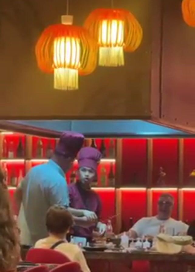 A video shows two chefs wearing purple hats cooking food on a large grill while a group of customers watch. The chefs work together, one preparing ingredients and the other using utensils on the grill. The customers sit around the grill, some watching intently while others talk and laugh. Red lighting illuminates the shelves behind the grill, displaying a variety of bottles and decorative objects. Overhead, three decorative lamps with orange shades hang from the ceiling. The scene appears to be a hibachi-style restaurant.