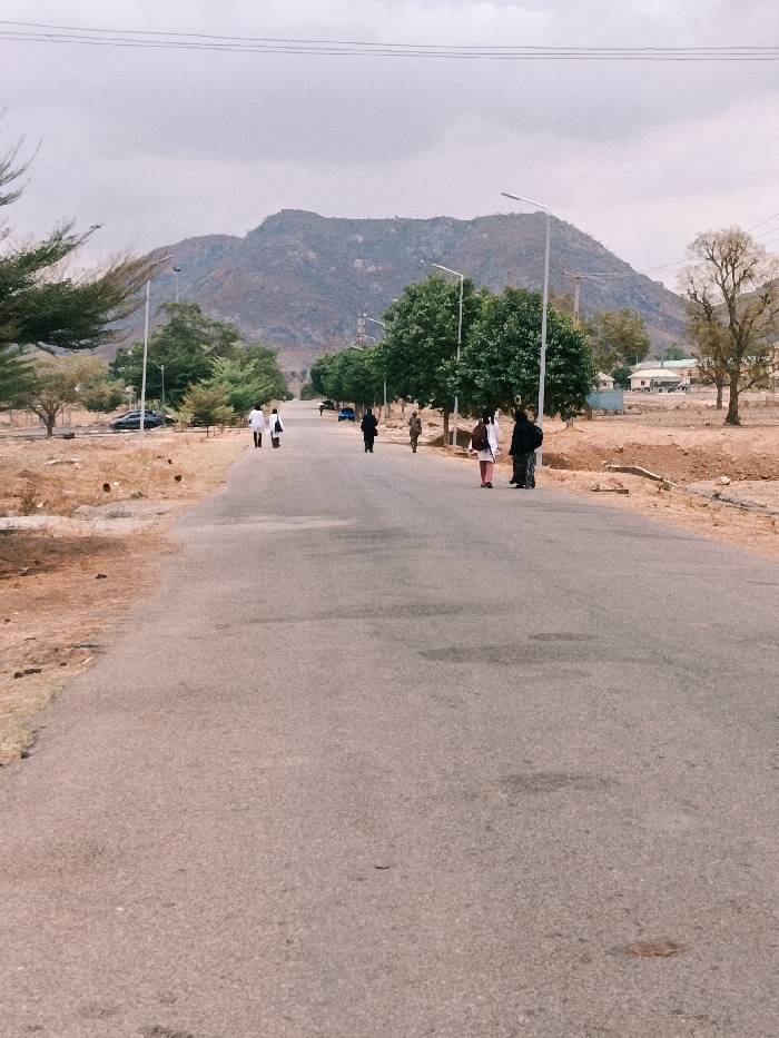 The image displays a paved road stretching into the distance in Rafin Pa, Nigeria, under a cloudy sky. A large, rugged mountain range dominates the background. The road's surface is gray asphalt, exhibiting minor wear. Along the left side of the road, dry, reddish-brown earth with sparse green and dry vegetation is visible, including several trees, one appearing leafless. A dark-colored vehicle is parked on the left side in the mid-ground. On the right side, a line of trees with dense green foliage runs parallel to the road, and a tall, lighter-colored tree with bare branches stands further back. In the far distance on the right, low-rise buildings with light-colored roofs are discernible. Multiple white-poled streetlights are positioned along both sides of the road. Ten individuals are present on the road, generally moving away from the camera. In the mid-ground on the left, two individuals wearing white long-sleeved tops and dark lower garments are walking side-by-side, one carrying a white bag. Further down the road on the left, another person in dark attire is walking. On the right side of the road, two individuals are standing facing away from the camera; one wears a dark top and light pants, and the other wears a white top, dark lower garment, and reddish footwear, with a dark bag on their back. Further back on the right, a person in dark clothing walks, followed by another individual in light brown attire.