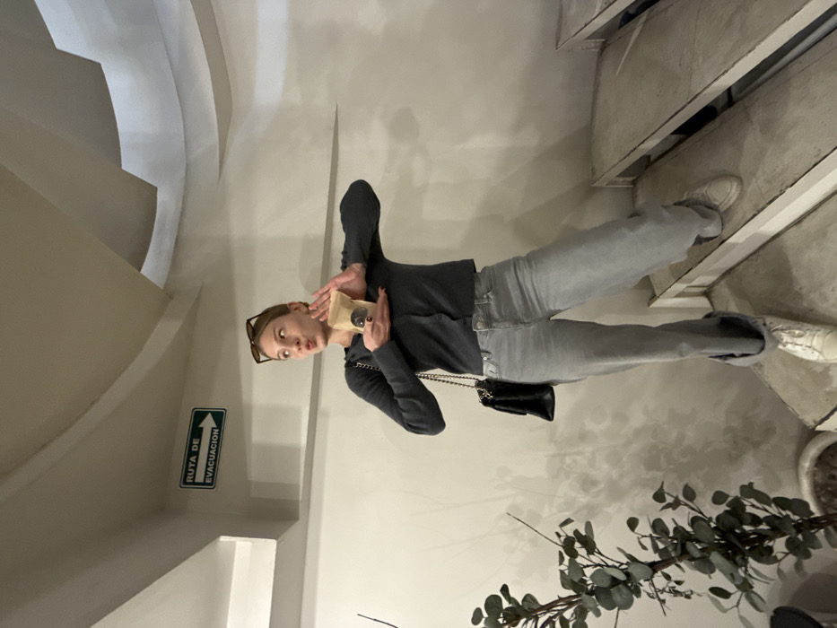 A young woman wearing jeans and a black top stands in front of a white wall while holding a cup with both hands. She has sunglasses perched on her head and looks to the left. A black purse hangs over her shoulder. An exit route sign is visible on the wall next to a stairwell. Plants sit on the ground.