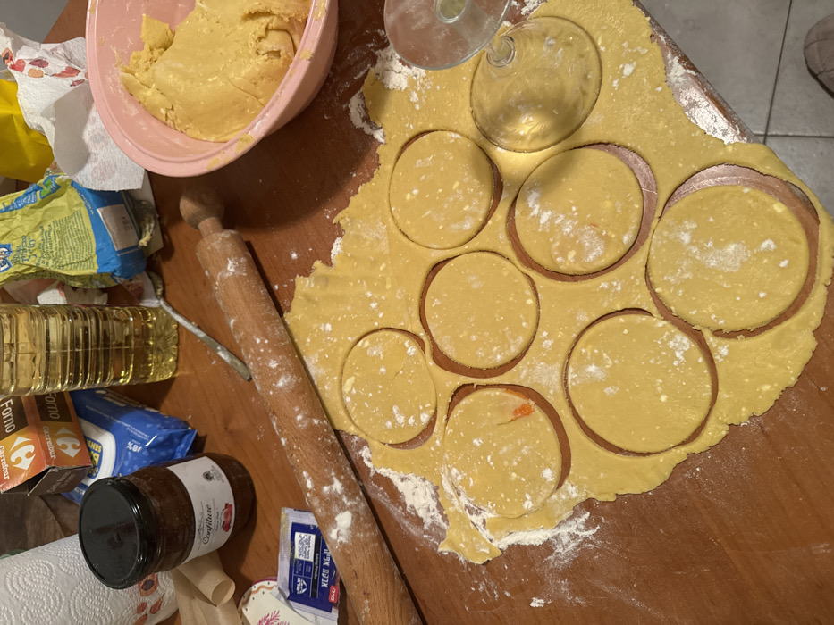 The image displays a busy domestic kitchen countertop in Milan, Italy, depicting an active food preparation scene. A sheet of light yellow dough, lightly dusted with white flour, covers a significant portion of the wooden surface. Eight circular dough cutouts are clearly visible within the rolled-out dough, with traces of a reddish-brown filling apparent beneath some of them. An inverted, clear-stemmed wine glass, currently serving as a dough cutter, rests on the far right, having just completed one of the circular impressions. A wooden rolling pin, also coated in flour, lies horizontally across the top left of the dough. In the upper right quadrant, a light pink plastic mixing bowl holds a large, unworked mass of the same yellow dough. The upper left area of the counter contains a glass jar labeled "Confiture" (jam), a tall, clear plastic bottle of cooking oil, a brown cardboard box featuring the "Carrefour" logo, and a crumpled yellow plastic bag. A small, blue and white sachet with Cyrillic text is visible on the far left, partially underneath the rolling pin. White paper towels are present on the left and right edges of the scene, and a metal spoon rests near the oil bottle.