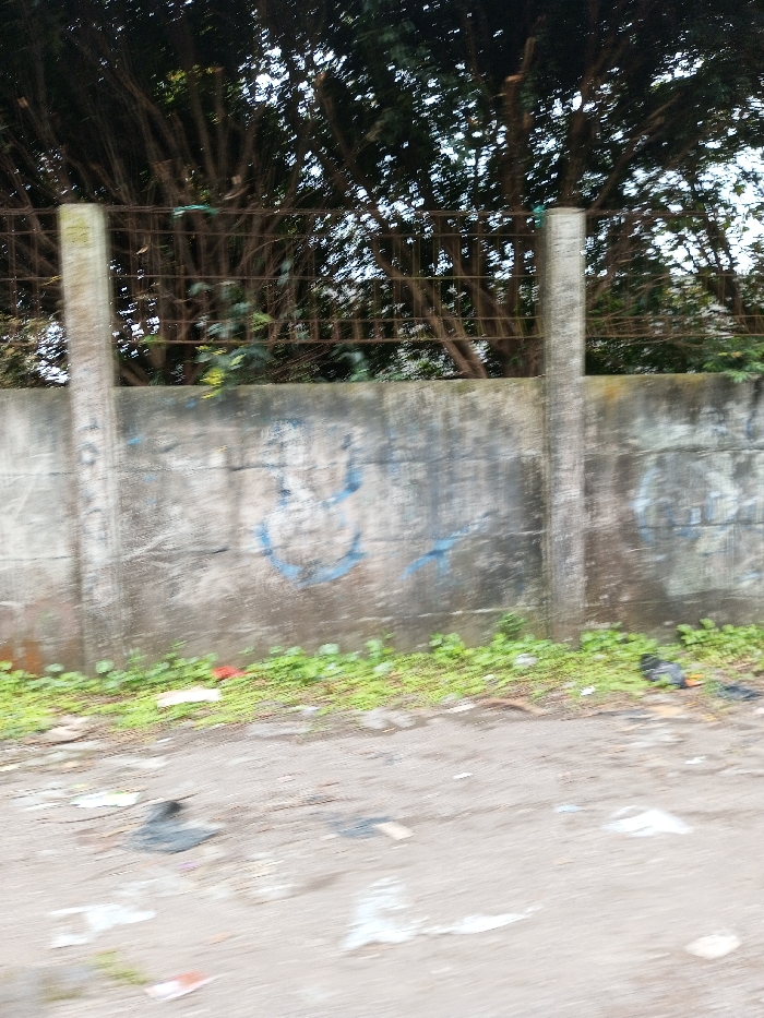 The scene depicts a neglected outdoor area in Vieng Phouka, Laos, viewed head-on under muted lighting. The lower third of the image features an uneven dirt ground, heavily soiled and scattered with assorted litter, including white plastic bags, dark plastic fragments, and indeterminate paper or fabric debris. Immediately above the ground, a strip of vibrant green, low-lying vegetation grows at the base of a weathered grey concrete wall. This wall displays extensive discoloration, dark grime patches, and multiple faint blue graffiti marks, one resembling a partial circular or U-shape. Two vertical concrete posts, one on the far left and another slightly right of center, extend upwards from the wall, supporting a rusty, dark brown metal fence with a grid-like pattern. Behind this fence, a dense mass of dark green foliage and bare tree branches occupies the upper background, indicating a heavily vegetated or overgrown area. No individuals or discernible actions are present in the frame.