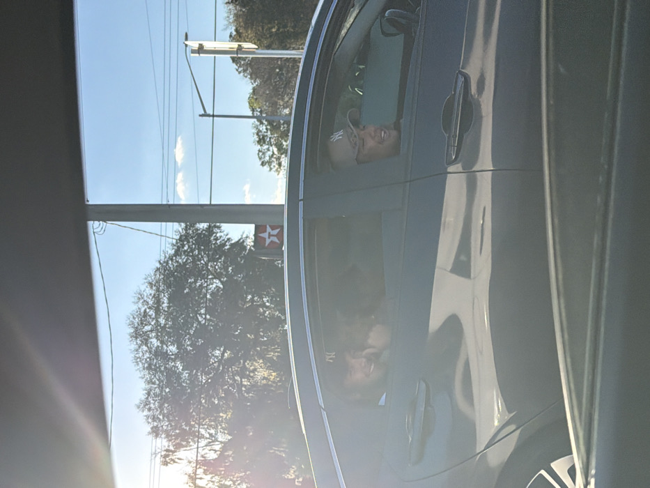 The image depicts a dark-colored sedan, likely gray or black, with two visible male occupants, captured from an adjacent vehicle. The scene is set in Gainesville, United States, near a Texaco gas station, identifiable by its red star logo visible in the background. The driver, an adult male of apparent East Asian descent, wears a light-colored New York Yankees baseball cap and eyeglasses. He is smiling and looking towards the right side of the frame. In the rear seat, directly behind the driver, a second adult male wears a dark New York Yankees baseball cap. He is smiling and looking directly at the camera, with his right hand raised near his face in an ambiguous gesture. The background features a large, leafy tree with Spanish moss, consistent with the Florida climate. Utility poles, power lines, and a street light pole are also visible against a clear blue sky with sparse clouds. The lighting indicates a low sun angle, with prominent lens flare emanating from the left side of the frame. Both visible individuals exhibit positive facial expressions.