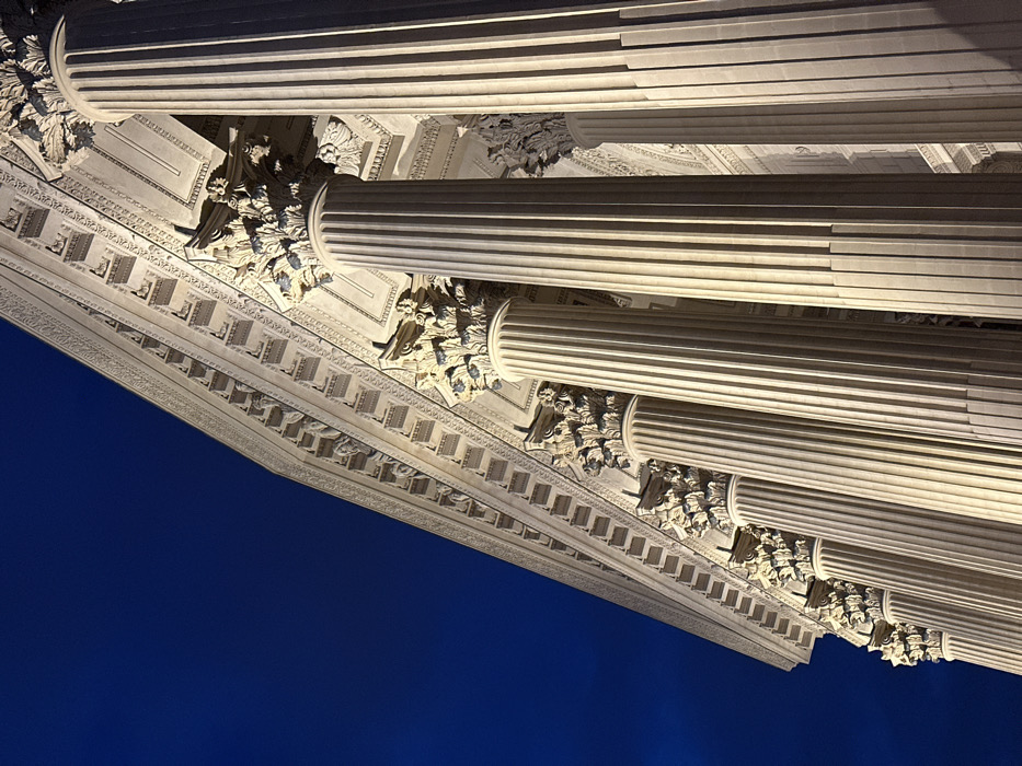 View looking up at the corner of a building, likely of classical design. The structure is adorned with fluted columns, intricate floral carvings, and dentil molding along the eaves. The lower portion of the image features a deep blue sky, contrasting with the cream color of the building. The angle of the shot emphasizes the height and grandeur of the architecture.