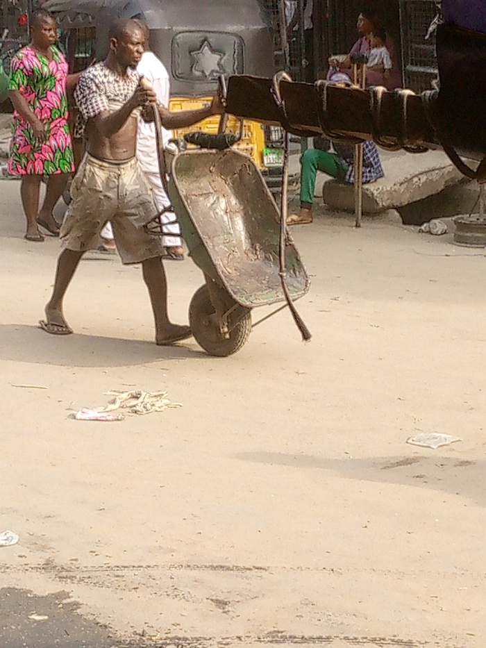 - "A shirtless man in shorts and flip-flops pulls a heavily soiled wheelbarrow down a dusty street" by FM-NeJAE2, licensed under CC BY 4.0