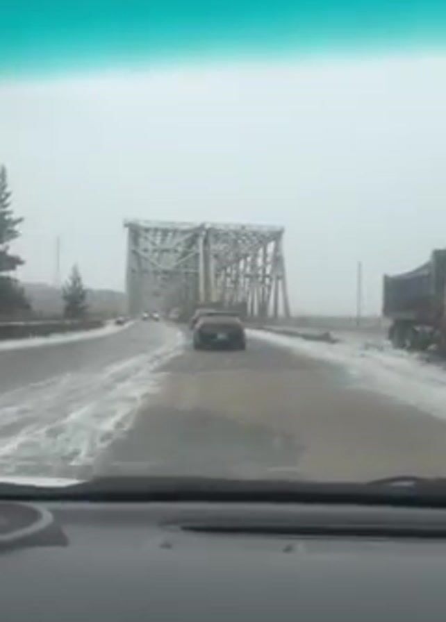 A vehicle, viewed from the inside, is driving on a snow-covered bridge. Other cars are also present. On the right side of the bridge is a large commercial truck. The bridge itself is an overhead truss structure. The weather appears to be overcast.