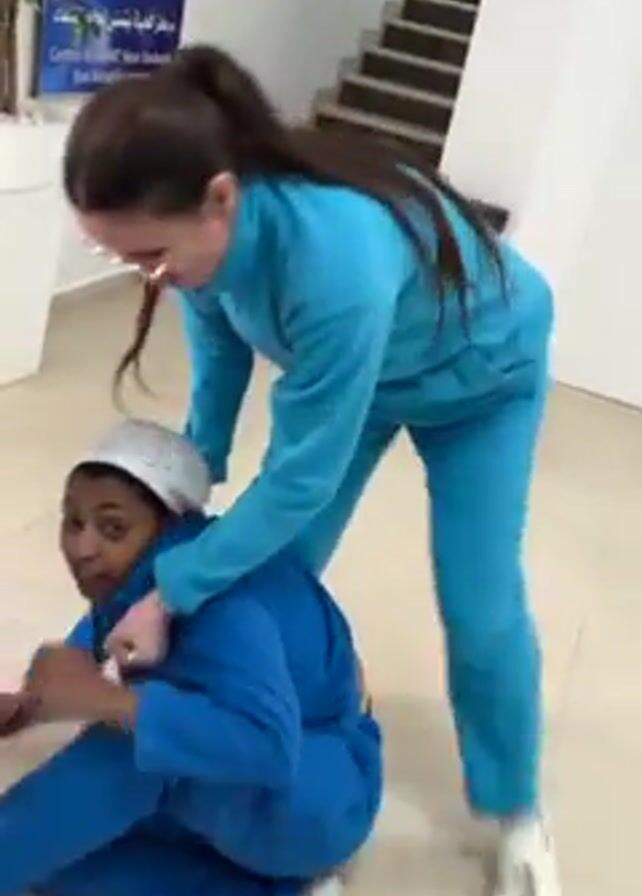 Two women, both wearing scrubs, are wrestling playfully on a tiled floor indoors. One woman is wearing blue scrubs and a white cap; she is on the floor. The other woman is wearing light blue scrubs and glasses. She is kneeling and holding onto the woman on the floor. Both women are smiling. In the background there are white walls, a staircase, a trash can, and a plant. There is a sign on the wall in a language other than English.