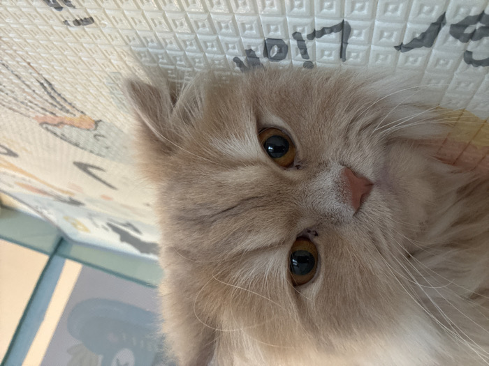 - "A close-up photograph depicts a long-haired domestic cat, light cream or champagne in color, positioned with its head inverted" by FM-VjBKw1, licensed under CC BY 4.0