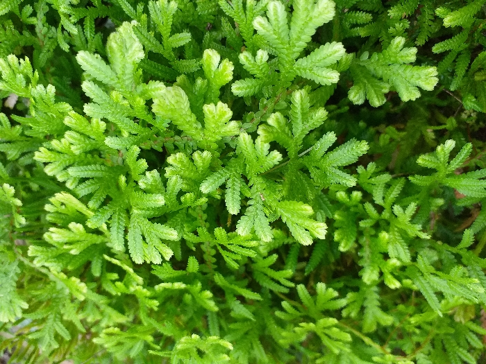 Lush, vibrant green foliage densely covers the scene. The plant features intricate, feathery leaves with a light green hue at the tips, creating a textured appearance. The plant appears to be a type of moss or fern, with a tightly packed growth pattern, adding to its overall fullness. Light and shadow play across the leaves, enhancing their three-dimensionality.