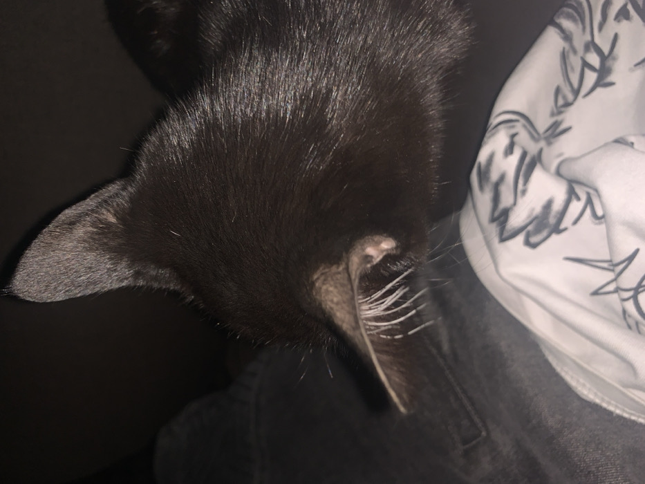 - "A black domestic cat is depicted from a top-down perspective, showing the posterior aspect of its head and its prominent left ear" by FM-VmBw42, licensed under CC BY 4.0