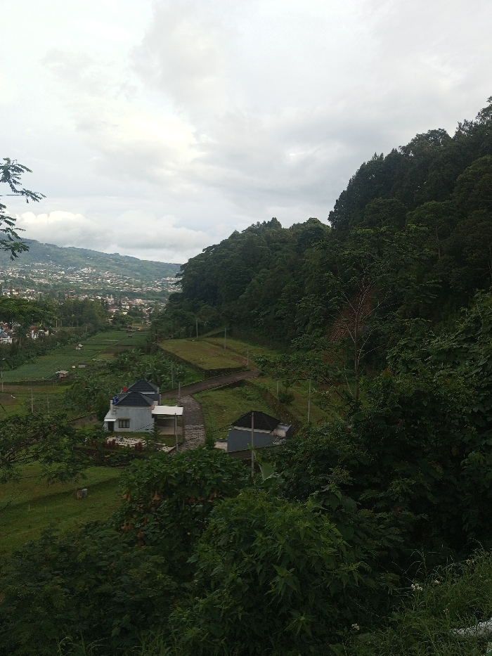 A verdant hillside scene shows a town nestled in the distance under a cloudy sky. A residential area features two prominent houses with gray roofs, surrounded by lush greenery and patches of cultivated land. The hillside is densely covered with trees and vegetation, transitioning from lower gardens to a thick forest climbing the slope. A paved road winds through the landscape. The image captures a serene blend of human habitation and natural environment.