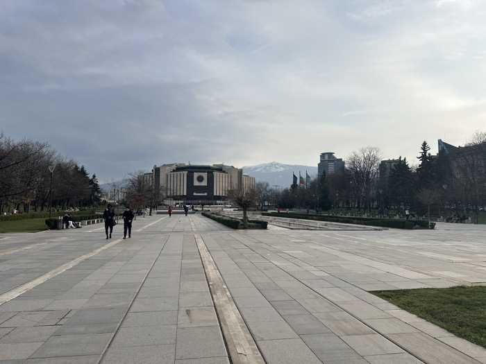 The image depicts the National Palace of Culture (NDK) and the surrounding Bulgaria Square in Sofia, Bulgaria, viewed from the south