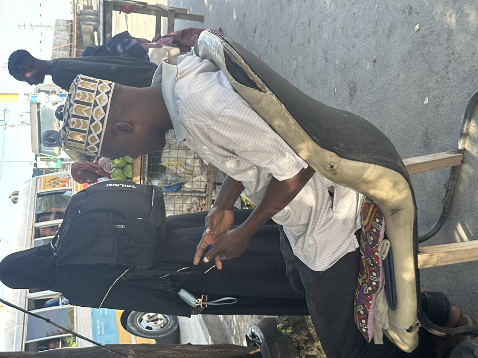 This image depicts an outdoor urban scene in Dar es-Salaam, Tanzania, likely a street or informal market area. In the foreground, a dark-skinned adult male is seated in a worn, light-colored office-style chair with a visible tear on its backrest and a small, colorful patterned cushion on its seat. He is seen in profile, facing towards the right side of the frame. He wears a light-colored, vertically striped polo shirt with a light blue collar and dark trousers. On his head, he wears a white Kofia (cap) with intricate gold and dark geometric patterns. His hands are raised, and his fingers are positioned as if manipulating a small object or device, though the object itself is not clearly visible. To the left of the seated man, partially obscured by a dark tree trunk or pole, stands an individual wearing a black abaya and a matching head covering. A black backpack with "TRILAISI" printed vertically on its side is worn on their back. A light blue keychain or small item hangs from their right hand. In the immediate background, behind the seated man and the standing individual, an informal market stall is visible, featuring a clear plastic bag containing green, round fruit (likely mangoes) on a wooden stand. Further into the background on the left, a light blue and yellow "dala dala" (minibus) with passengers visible through its windows is parked or moving slowly. On the right, a dark-skinned individual with short hair stands, facing towards the right. Behind them, part of a large truck and a wooden stand are visible. The scene is brightly lit by natural daylight, casting subtle shadows. The ground appears to be paved or hardened dirt.