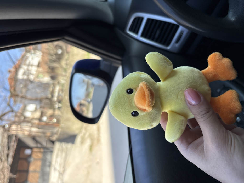 A light-skinned hand, exhibiting manicured nails with light pink polish, holds a small, bright yellow plush duck toy with black button eyes and an orange beak and feet. The image is captured from inside a vehicle, with a dark dashboard, a segment of a black steering wheel, and a silver-framed air vent visible to the right of the toy. A blue-cased side mirror is prominent, reflecting a blurred street scene. Through the car's windshield, a street in Lukovit, Bulgaria, is visible. The background features several two-story structures with reddish-brown tiled roofs and light-colored facades, one of which displays large wooden double doors. Bare trees and dry ground are present under a clear blue sky.