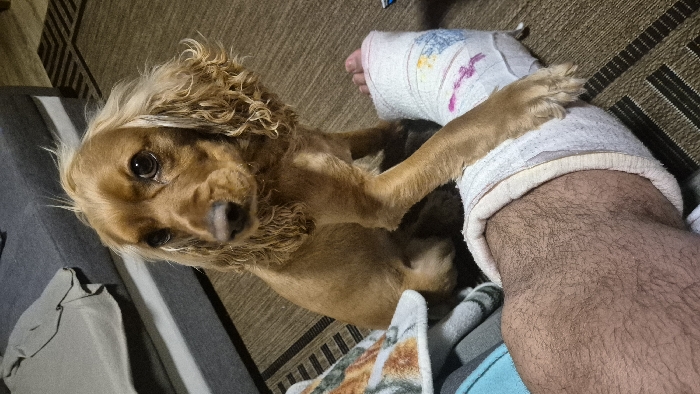 - "An indoor scene in Melle, Belgium, depicts a tan-colored Cocker Spaniel-type dog sitting beside a human leg with a plaster cast" by FM-IS3x72, licensed under CC BY 4.0