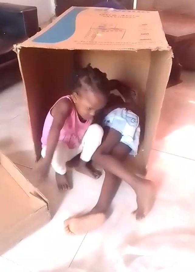 A video shows two young children playing in a cardboard box. One child, wearing a pink tank top and white pants, stands outside the box. The other child, wearing a white top and a diaper, is lying down inside the box. The box is brown and has blue and white markings on the top. The background includes a light-colored tiled floor, and furniture. The child in pink interacts with the child in the box, moving in and out.