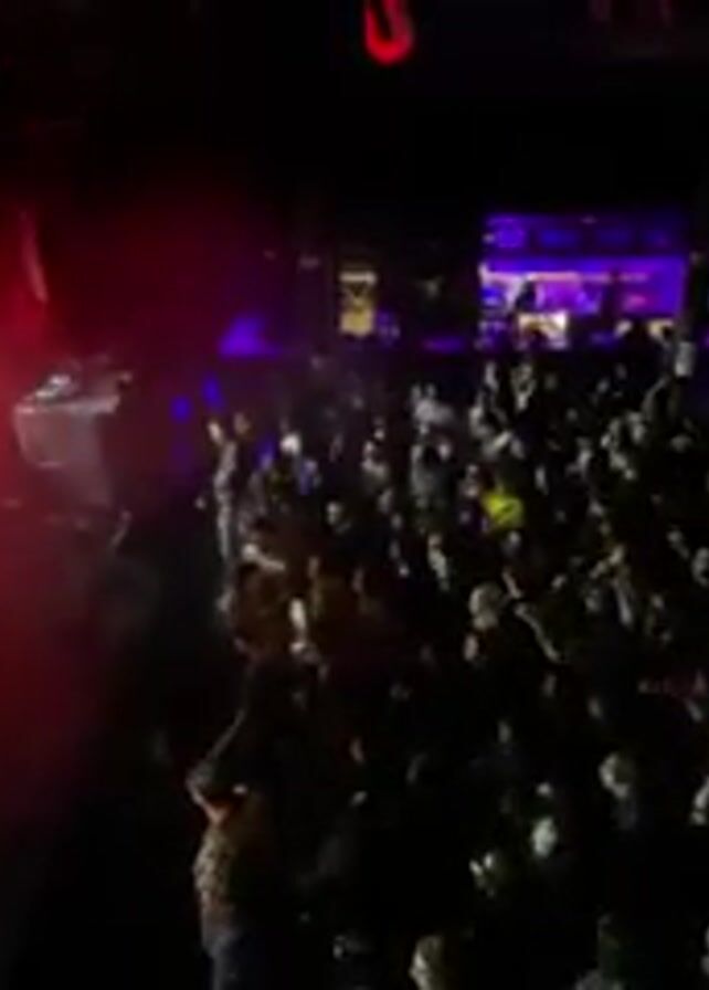 A live concert is underway. Red stage lights illuminate the performing band on the left side, partially obscured by a cloud of stage fog. A large crowd of people is visible, dancing and watching the performance. A bar area with lights is visible in the background.