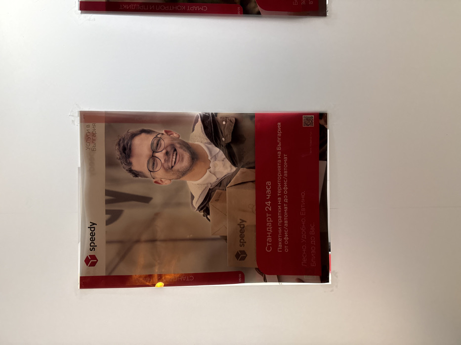 A "Speedy" parcel delivery service advertisement poster is affixed to a plain white wall in Varna, Bulgaria