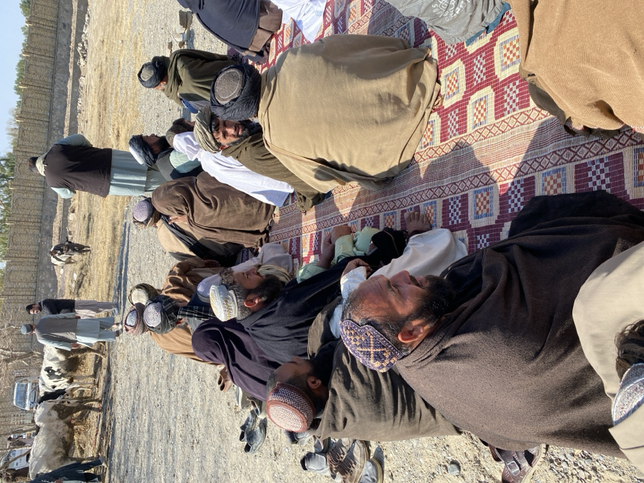 A group of men in traditional clothing and hats are praying on a woven mat outdoors. They are lying prostrate, some covered in blankets or shawls. In the background, other men stand near cows, a vehicle, and a dirt road. A low wall is visible in the distance. The overall scene suggests a religious observance in a rural setting.