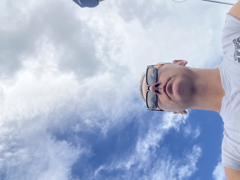 A low-angle selfie captures a person wearing sunglasses against a sky filled with fluffy white clouds and patches of blue