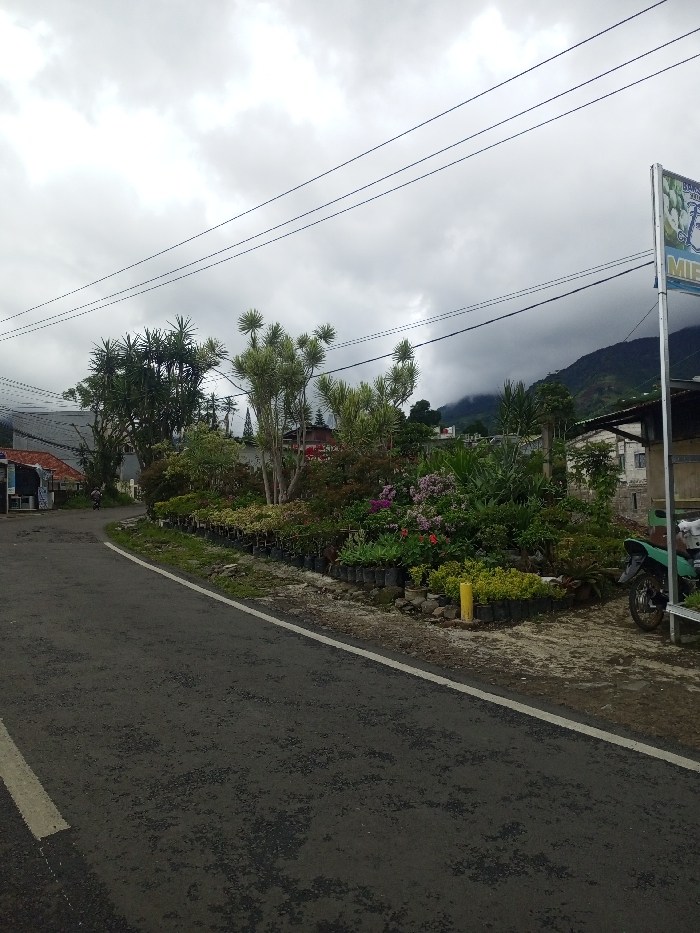 A roadside view shows a lush plant nursery. Various potted plants and flowers overflow onto the edge of the road. Power lines crisscross the sky. A motorcycle is parked near a sign. In the background, hills are partially obscured by clouds. The asphalt road curves gently. The sky is overcast.