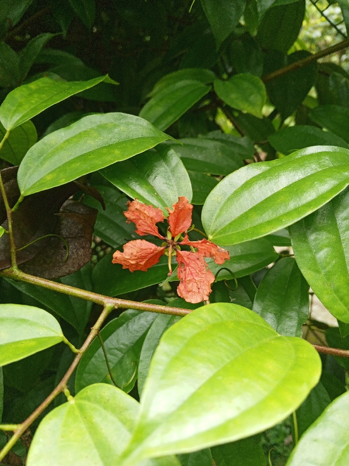 A cluster of vibrant green leaves envelops a dried, reddish-orange flower. The leaves are smooth and oval-shaped, catching the light with a glossy sheen. Brown stems intertwine among the foliage, supporting the delicate flower with its five withered petals. The overall composition suggests a natural setting, a close-up view of plant life undergoing seasonal change.