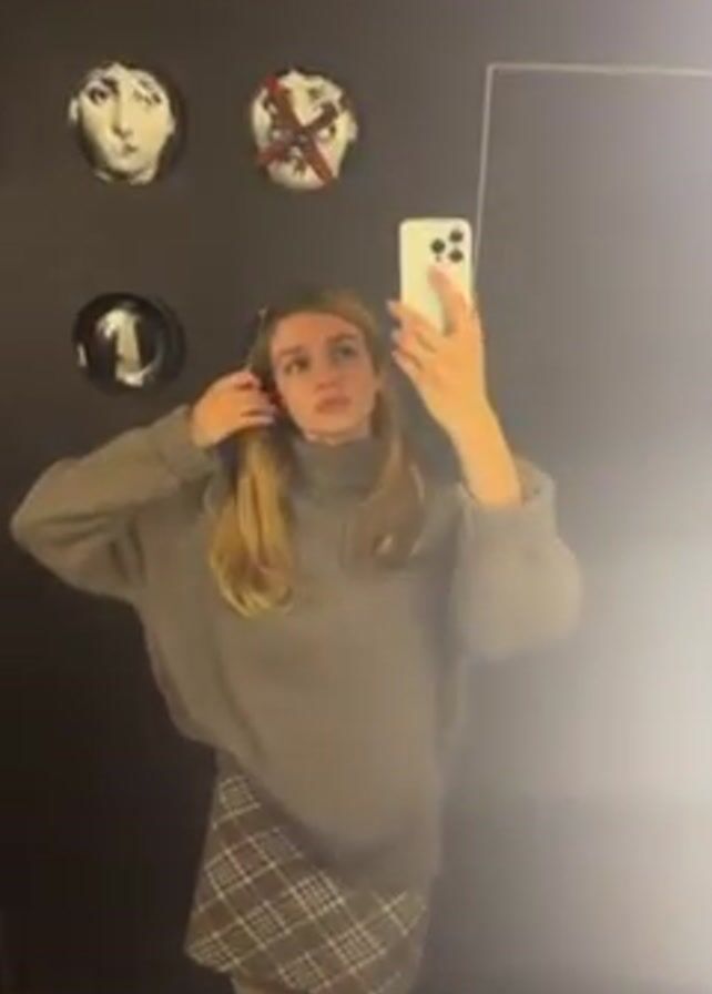 A woman with blonde hair and a gray turtleneck sweater is taking a selfie in a mirror. She's also wearing a plaid skirt and light-colored tights. The background includes a dark wall decorated with small, round plates featuring facial images. She poses, touching her hair and making a kissing face toward the camera. Her white smartphone is visible in her hand, and a ring is on her finger. The setting appears to be a bathroom or restroom, with a glimpse of a sink and fixtures at the bottom of the frame.