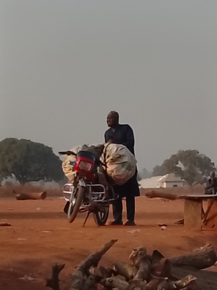 A man stands beside a red motorcycle laden with large bags. The bike is parked on a dusty, reddish-brown ground with scattered logs and wood debris. In the background, there are trees, a small white building, and a partially visible table with people sitting nearby. The sky is a hazy gray, suggesting an overcast or dusty atmosphere. The man is wearing dark clothing.