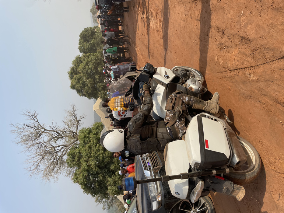 A motorcyclist in gear, including a white helmet and armored suit, sits on a white BMW motorcycle near a black SUV. The background features a large gathering of people under trees. The scene appears to be outdoors on a dirt road with a tree with bare branches in the left corner. The sky is hazy.