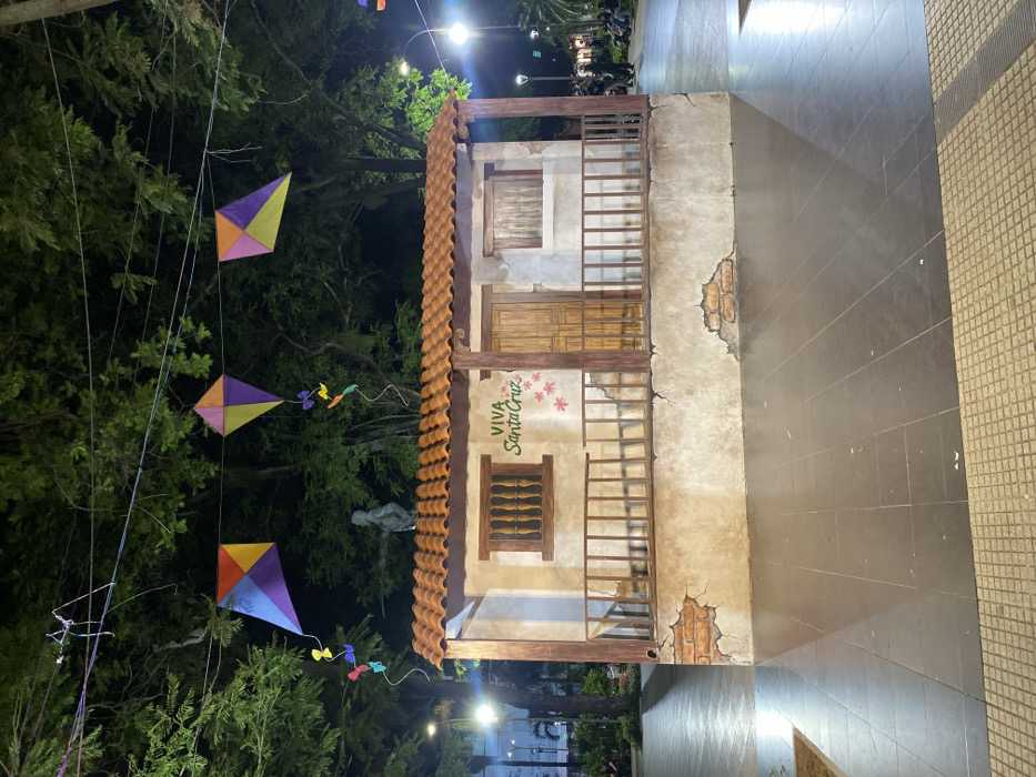 A mural depicting a two-story building sits on a paved surface, with the inscription "Viva Santa Cruz" and flower details on the lower level. The mural features wooden balconies and a tiled roof. The backdrop includes trees, streetlights, and kites hanging from lines. The ground is paved with dark and light tiles.