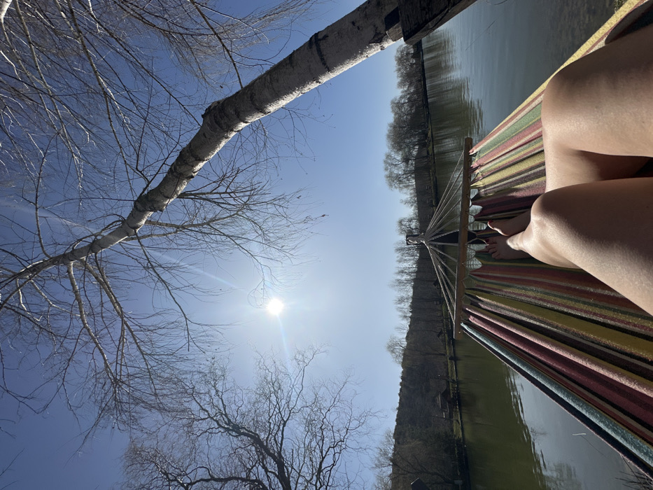- "The image presents a first-person view from a multi-colored striped hammock, revealing the bare legs and feet of an individual resting within it" by FM-E8AIA3, licensed under CC BY 4.0
