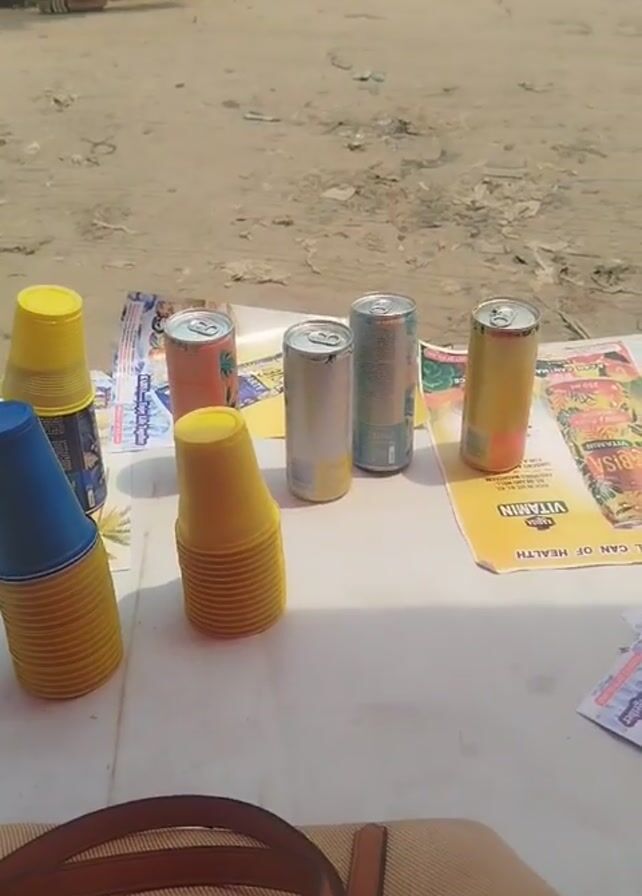 n outdoor scene on what appears to be a street. In the foreground, a white table holds stacks of yellow and blue plastic cups, several cans of drink, and advertisement pamphlets. A brown bag rests at the bottom edge of the frame. People are walking past in the background. A man in an orange shirt then pushes a wheelbarrow with a shoe sitting on it across the scene behind the table. A small bird is perched on the wheelbarrow. The sound of music is audible in the background.