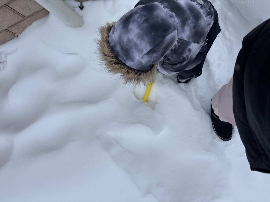 A person in a cloudy gray and black jacket is using a yellow object in the snow. The person is bent over, looking down at the object in the snow. To the right, another person wearing a black jacket, light pink pants and black boots. The ground is covered in snow, with a white pipe in the upper left corner. The snow appears to be thick.