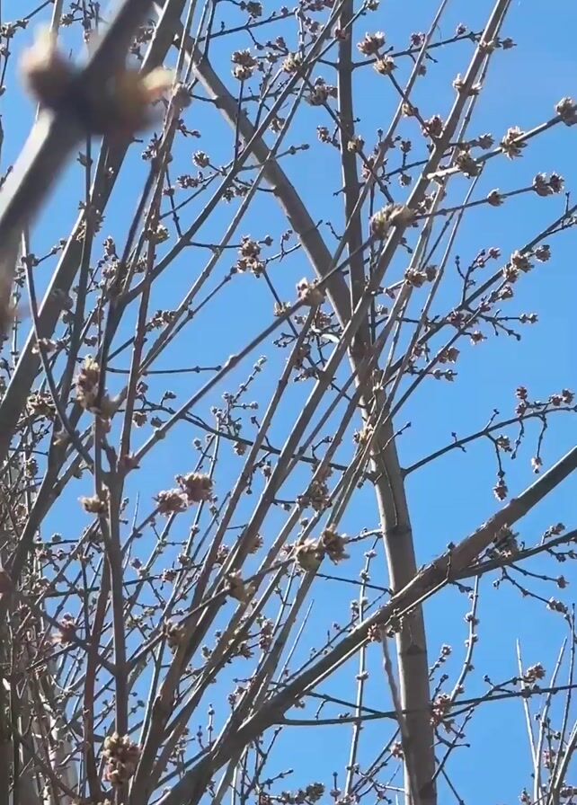 tree branch with small, brown buds emerging against a clear, bright blue sky