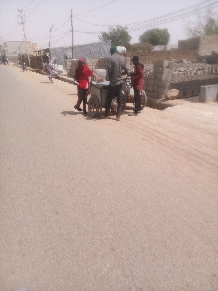 The scene depicts a daylight street view in Rangaza, Nigeria. The foreground consists of a wide, unpaved or light-colored asphalt road. In the midground, three individuals are gathered around a mobile vendor cart positioned on the road's right shoulder. An adult male, wearing a dark grey shirt, dark pants, and a green head covering, stands behind a two-wheeled vendor cart containing a light-colored container. To his left, a young person in a red top and red headscarf stands facing the cart. To his right, another young person in a dark red top stands adjacent to a white bicycle parked on its kickstand. Further down the road on the left, another individual is partially visible walking away. The background on the right features a large stack of light-grey concrete blocks or bricks, suggesting a construction site, beside a dirt shoulder. Behind this, low-rise buildings with corrugated metal roofs are visible. On the left side of the road, utility poles with multiple overhead lines extend into the distance, paralleled by additional low-rise structures. The sky is bright and appears hazy. Sparse vegetation and trees are present in the distant background.