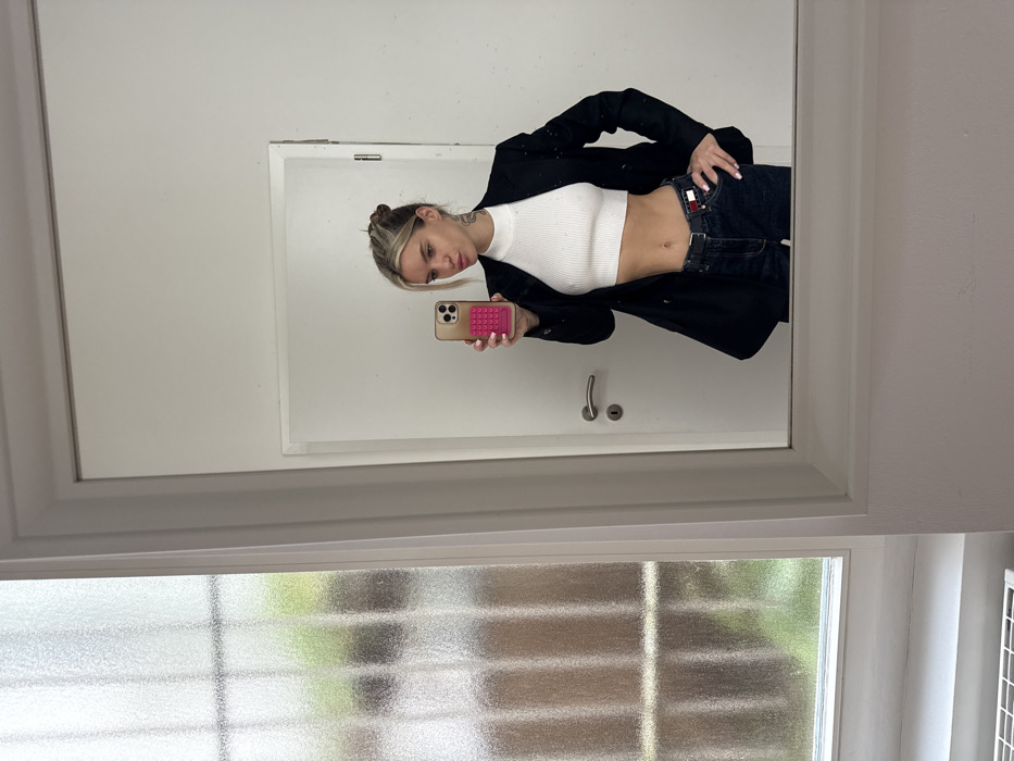 A light-skinned female subject is depicted taking a mirror selfie indoors in Berlin, Germany. The subject, characterized by blonde hair styled in a bun, visible neck tattoos, and a midriff piercing, wears a white ribbed mock-neck crop top, a dark blazer, and dark jeans with a red, white, and blue branded tag on the right hip pocket. She holds a gold-toned smartphone with a bright pink, textured case in her left hand, directed towards the mirror. Her right hand rests on her hip. The subject's lips are slightly parted, and her gaze is directed towards the smartphone/mirror. The environment includes a large, rectangular mirror with a light-colored frame, reflecting the subject and parts of the room. To the left of the reflected subject, a white interior door with a silver handle is visible in the mirror. Adjacent to the mirror on the far left, a tall, narrow window with frosted or textured glass shows a blurred view of vertical bars and indistinct green foliage beyond, suggesting an exterior outlook. Below this window, a white horizontal grate or vent is present. The walls of the room are white.