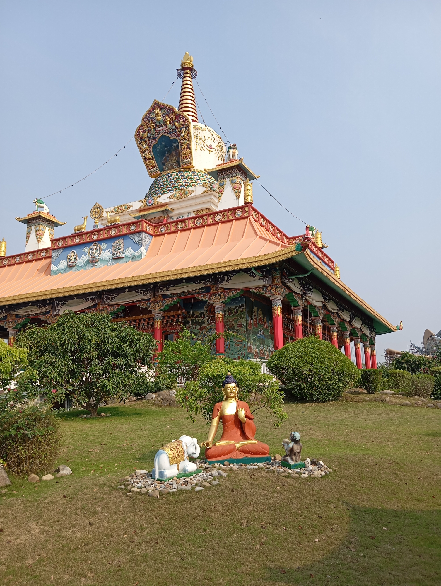 The image depicts a large, ornate Buddhist temple or monastery in Lumbini Sanskritik, Nepal. The structure is multi-tiered, with a prominent stupa-like tower adorned with colorful patterns and gold accents at the top. The main building has a wide, overhanging orange roof supported by numerous red pillars with intricate designs. The walls feature murals and decorative elements. In the foreground, there is a manicured lawn with several bushes and trees. On the lawn, a seated Buddha statue is present, colored orange and gold. To the left of the Buddha statue, there's a white elephant statue, and to the right, a small grey statue of a meditating person. The statues are situated on a bed of light-colored stones. The sky is clear and light blue. The overall impression is that of a well-maintained religious site.