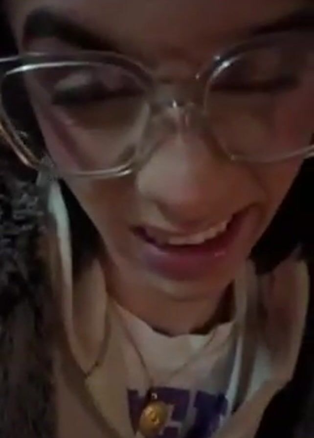 The video features a woman with dark hair, wearing glasses and a necklace, looking directly at the camera. She is wearing a light-colored sweatshirt with a purple graphic and a grey fur jacket. She is possibly outdoors, given the background lighting and the way the camera is moving. The camera angle is close, providing a clear view of her face.