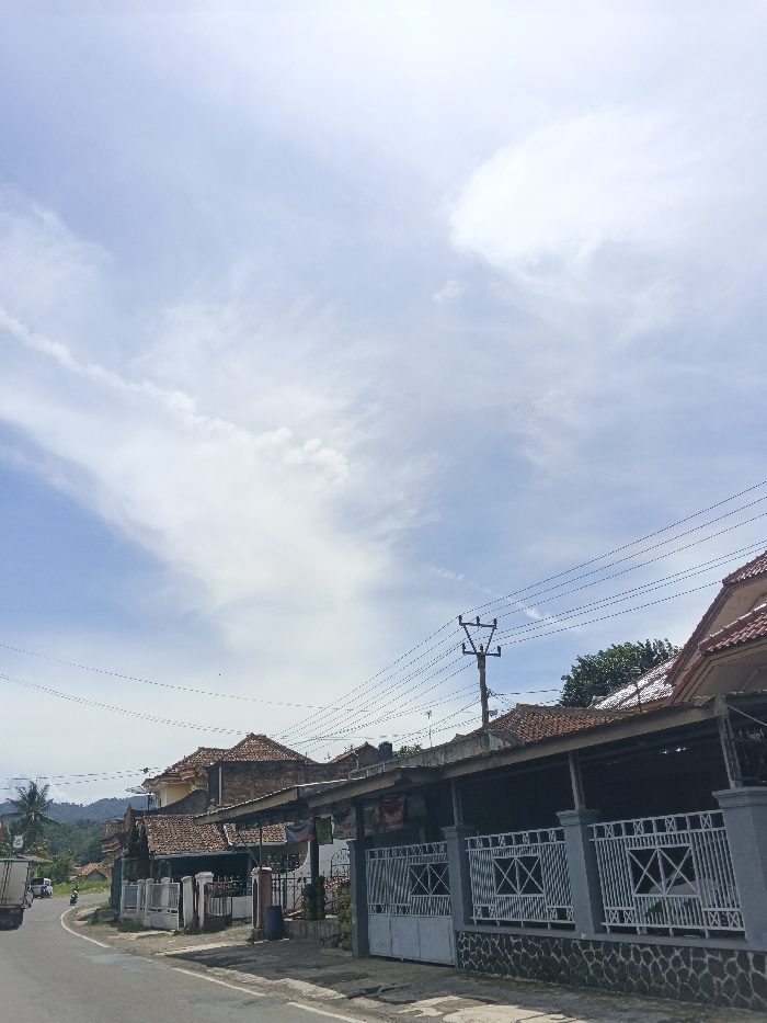 A street scene shows houses with tiled roofs and gated yards along a road under a bright, cloudy sky