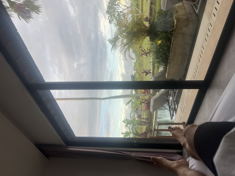 From a prone position, a view through a dark-framed window reveals a cloudy sky and lush, tropical vegetation. Palm trees and other plants are visible, along with a glimpse of a swimming pool and lounge chairs. The feet of the person lying down are visible in the foreground, close to the bottom edge of the window frame. A portion of bedding is also visible near the bottom right corner.