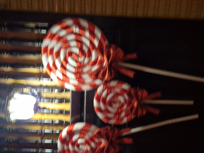 The image depicts three decorative lollipops, varying in size, positioned in the foreground against a dark background. From left to right, a large red and white spiral lollipop with a red glitter bow on a light stick is partially visible. A medium-sized matching lollipop is centrally located, followed by a smaller one to the right, also with a red bow and light stick. In the upper background, a wall-mounted light fixture with a white, fluted glass shade is illuminated. Below and behind the light, a wooden balustrade or railing with vertical balusters is discernible. A section of light brown, vertically textured wall paneling is visible on the far right. No people are present. The scene captures a stationary indoor decorative display. The specific location within Đà Nẵng, Vietnam, cannot be identified from the visual data.
