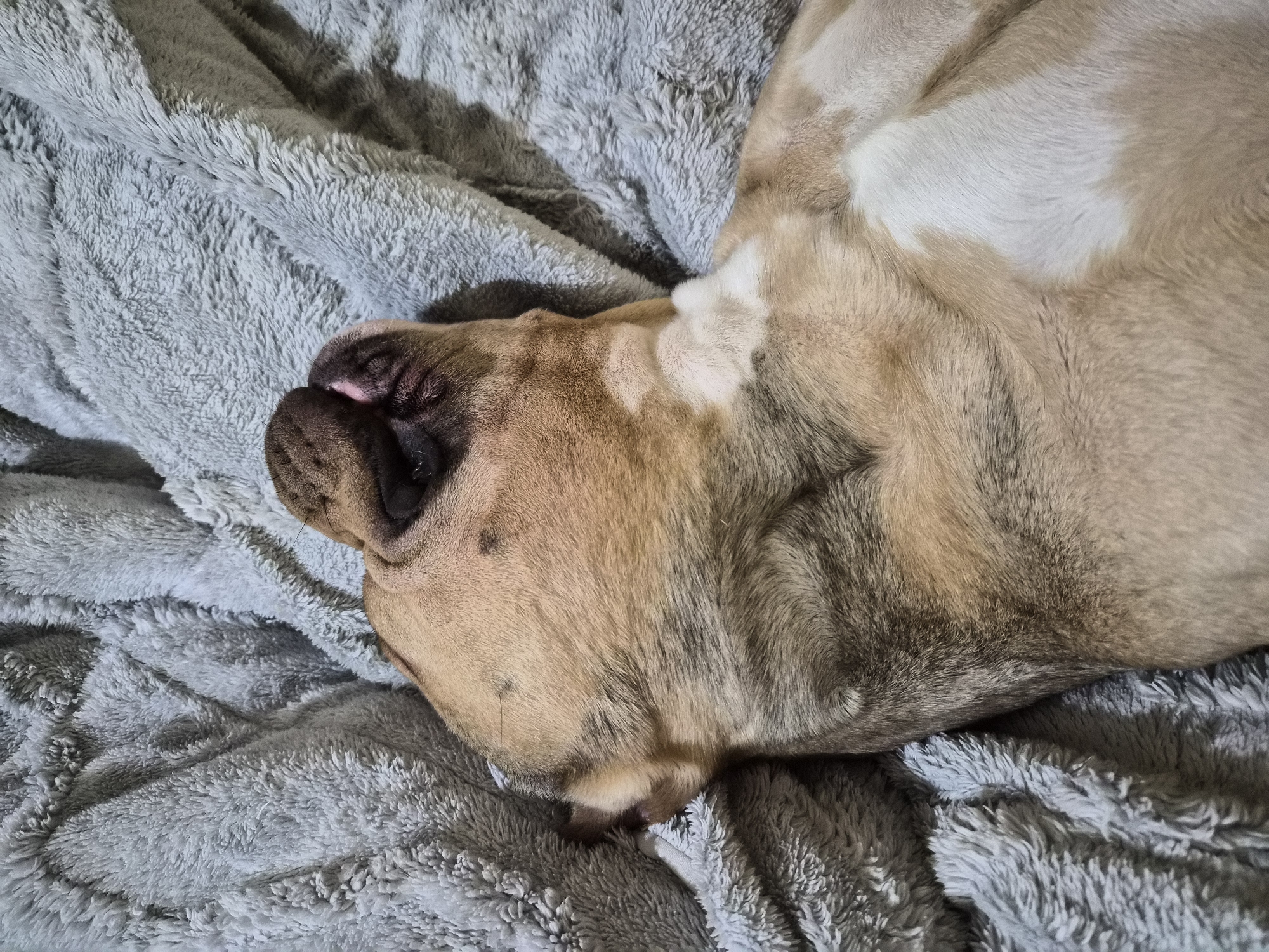 - "A tan and white bulldog lies on a gray blanket" by FM-Q4o4Y2, licensed under CC BY 4.0